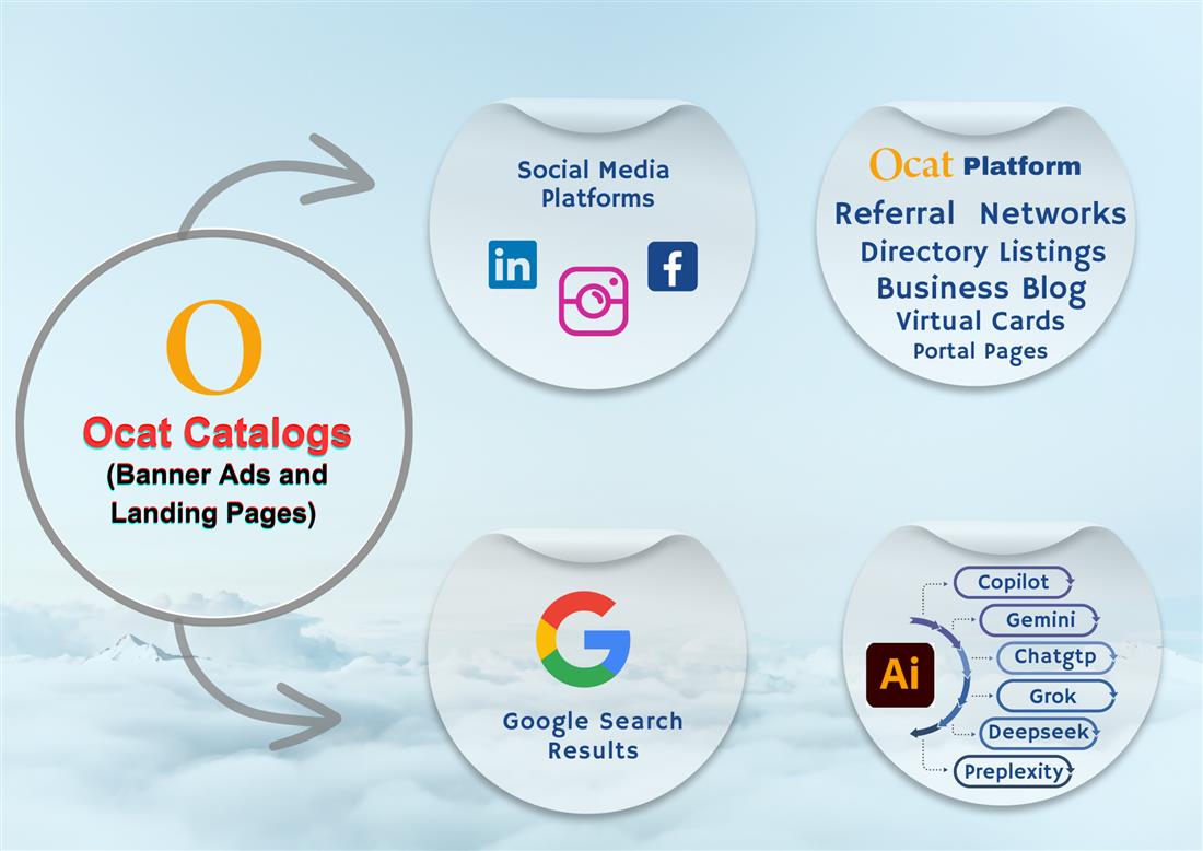 Ocat® Promote: helps businesses get discovered across search engines, social media, referral networks, Portals and AI assistants in UAE.